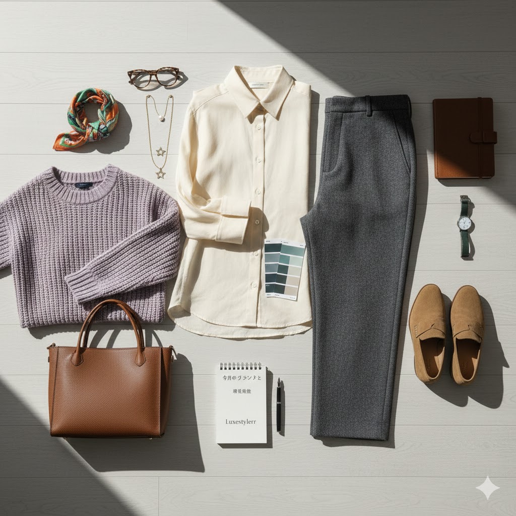 • 色: その季節のトレンドカラーをスカーフ、靴、またはインナーでさりげなく取り入れる。